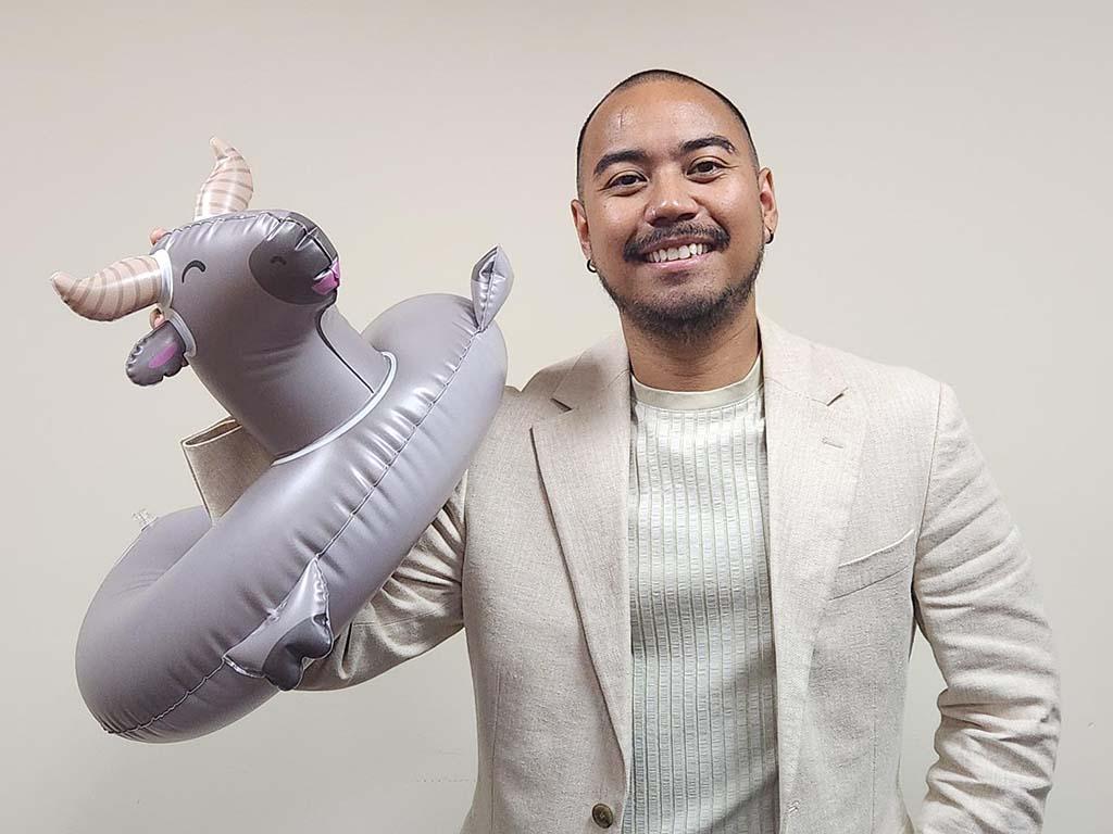 Jonah Babauta, with a Karabo floatie for children being developed. Photo by Maureen N. Maratita