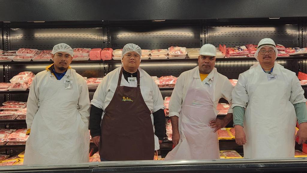 (From left) Penny Satae, meat merchandizer; Michael Calma, meat merchandizer; Michael Mindel, meat supervisor; and Tommy Guerrero, meat supervisor. The four members of the Meat Department were working at Sinajana Pay-Less Supermarket on Nov. 29. The store held its soft opening on Nov. 21 and its grand re-opening will be held on Dec. 6.